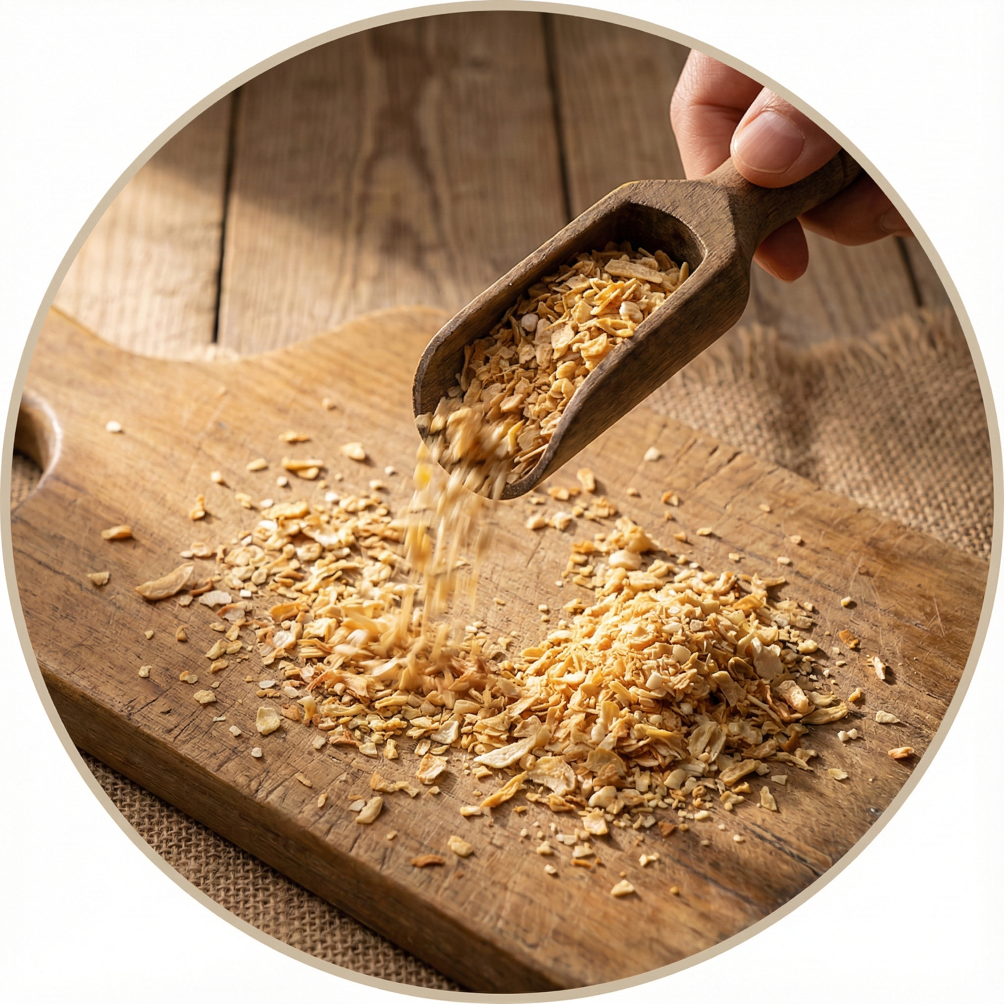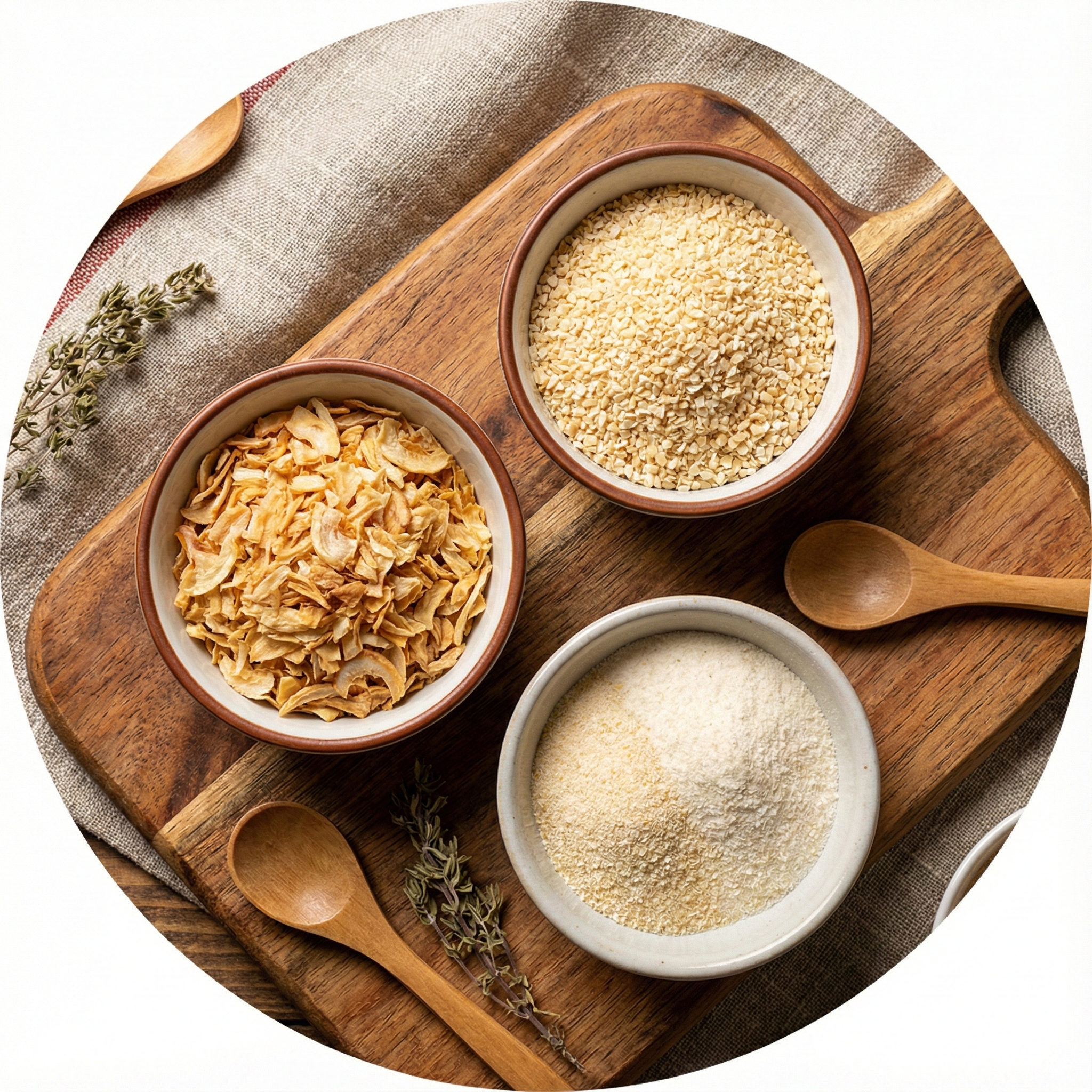 Golden onion flakes, ivory garlic granules, fine white powders — each with a color that speaks of natural goodness and careful craftsmanship. What you see is what you taste: clean, pure, and full of life.